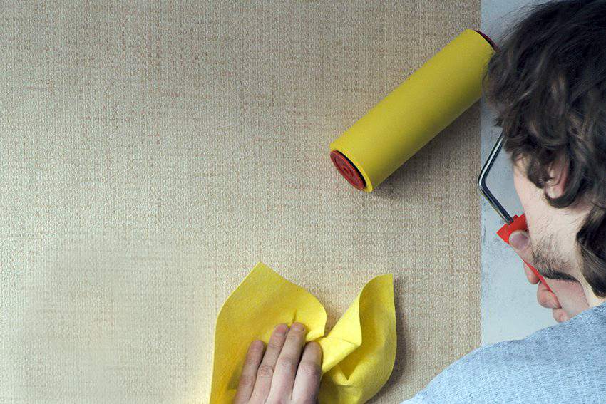 - Ein ausgewähltes Stück wird auf die Vertikale aufgetragen und mit einem sauberen Lappen oder einer speziellen Rolle von der Mitte bis zu den Kanten glätten Sie das Blatt von Blasen und Defekten.