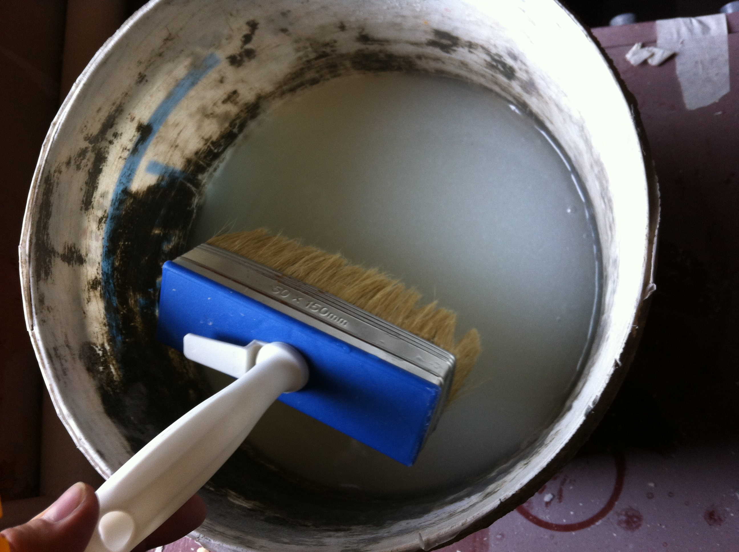 Für besonders schwere und dicke Arten von Beschichtungen wird ein Stumpf-Vorhang-Klebeverfahren verwendet. Überschüsse werden mit einem scharfen Messer und einem Lineal gereinigt.