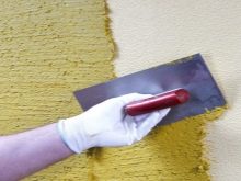 Flüssige Tapete an der Wand mit einem Spachtel, Rolle Konstruktionswalze, eine spezielle Pistole besprühen. In jedem Fall ist der Materialverbrauch unterschiedlich, weil die Dicke der Mantelschicht selbst variiert, die von 2 bis 6 mm betragen kann.