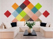 Einige Sorten werden für die Wanddekoration auf Grundtapeten oder für die Herstellung von Patchwork-Technik in hellen Designstilen gekauft, indem vorgestanzte quadratische oder rechteckige kleinformatige Tapetenfragmente auf eine Akzentwand geklebt werden. In diesen Fällen Materialverbrauch wird mehr sein, weil solche Methoden die Verwendung einer kleinen Menge an Material in der Dekoration beinhalten. Daher wird es viele Überbleibsel geben.