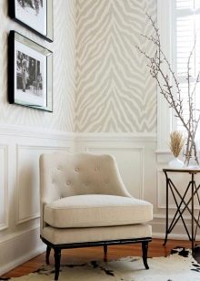 Auf diese Weise Es ist wichtig, darauf zu achten, dass die Dekoration zwei Arten von Tapeten verwendet: mit einem Muster und schlicht. Es lohnt sich, von Erwägungen der Praktikabilität und Einfachheit des Gegenüberstellens auszugehen. In diesem Fall sind die Vorsprünge und andere Merkmale leichter ohne Muster auf das Material zu kleben: die Krümmung der Wände wird nicht bemerkbar sein, es ist einfacher, die Kanten zu kombinieren und sie nötigenfalls mit Formteilen oder einem Baguette zu schließen. In diesem Fall kann die Hauptebene der Wände parallel zum Boden geklebt werden.