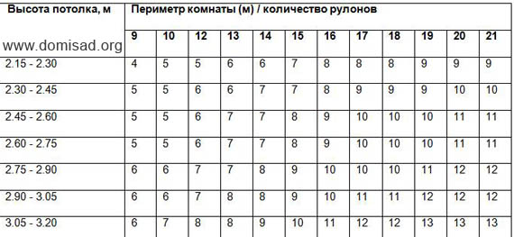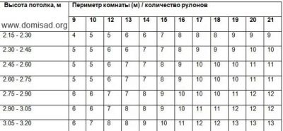 Beim Trocknen kann sich das Material neigen, was das perfekte monolithische Aussehen der Wandverkleidung verderben kann. Nach dem Betrachten der Tabellendaten wird die erforderliche Menge durch die Höhe der Decke und den Umfang des Raumes bestimmt. Bitte beachten Sie, dass diese Höhen sich um 15 cm unterscheiden: Das bedeutet, dass es nicht praktisch ist, den Materialkolben zu verwenden, Sie benötigen einen kleinen Rand.Oft wird die Reparatur nicht sofort nach dem Kauf durchgeführt, es wird nicht einfach sein, die Tapete, die Sie später brauchen, aufzunehmen, weil jeder Stapel in seinem Farbton und der Sättigung des Musters unterschiedlich ist.