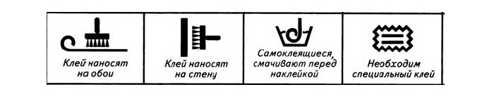 - Symbole mit einem Pinsel zeigen dies an wie man klebt Tapetenbelag an der Wand. Sie können von ihnen erfahren, Kleber direkt auf die Leinwand oder Wand auftragen, selbstklebende Tapeten kleben, und ob Spezialkleber benötigt wird (weitere Informationen vonHersteller oder müssen Sie mit dem Verkäufer zu überprüfen).