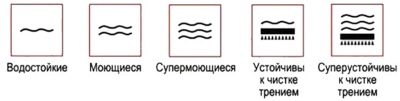 - Diese Bezeichnungen zeigen an Feuchtigkeitsbeständigkeit (Wellenlinien) und Beständigkeit gegen mechanische Beschädigung (Wellenlinien mit einer Bürste). Dementsprechend ist das Material umso widerstandsfähiger gegenüber Feuchtigkeit und Detergenzien, je mehr Wellen es gibt. Das letzte Symbol zeigt an, dass die Tapete mit einer weichen Bürste gewaschen werden kann und chemische Reinigungsmittel verwendet werden können.