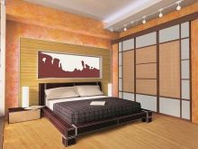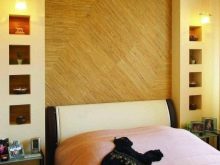 Um eine originelle Ecke im Schlafzimmer zu schaffen, können Sie Kompositionen aus Schmetterlingen oder Sakura-Ästen machen. Sie sind über dem Kopfteil in Form eines breiten Streifens angebracht. Das resultierende Bild wird harmonisch vor dem Hintergrund der furnierten Wände aussehen. Perfekt ergänzen diese Dekor- und Stroh- oder Korktapete.