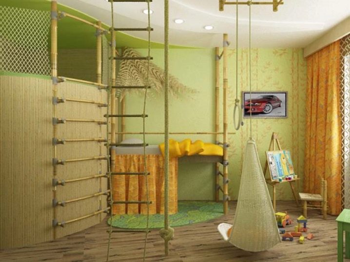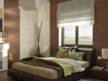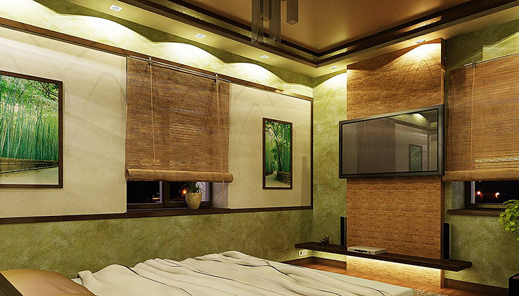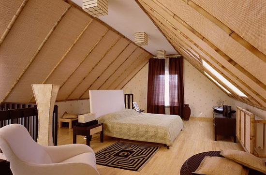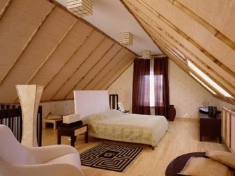 Dicke Bambusstiele sehen gut in den Schlafzimmern auf dem Dachboden aus, ihre Farbe sollte auf die Möbel im Zimmer abgestimmt sein. In der Regel sollten einfache und massive Module aus Naturholz bevorzugt werden. Das Innere eines solchen Schlafzimmers sollte aus hellem Parkett, breiten Rollläden an den Fenstern und Bambuswänden bestehen.