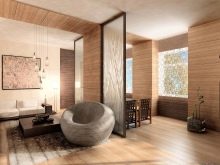 Darüber hinaus sehen auch einzelne, mit Bambus verkleidete Wandteile schön aus. Solche Paneele werden nicht nur dazu beitragen, die Zoneneinteilung zu vervollständigen, sondern auch auf andere Objekte im Raum aufmerksam zu machen.
