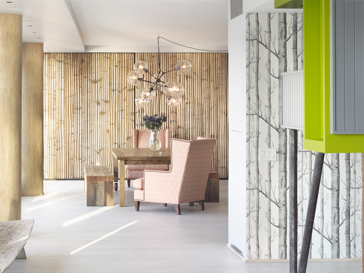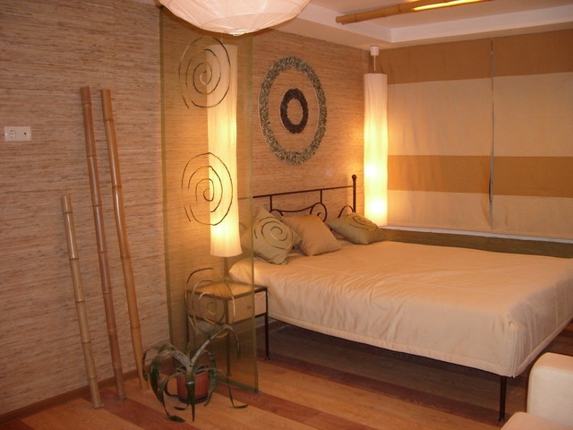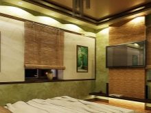 Um das Design im Raum zu gestalten, ist es nicht notwendig, die gesamte Wand mit Bambus-Tapeten zu verkleben, es genügt, nur einen kleinen Bereich zu verwerten und es zum Hauptaugenmerk im Raum zu machen.