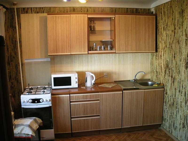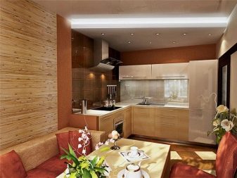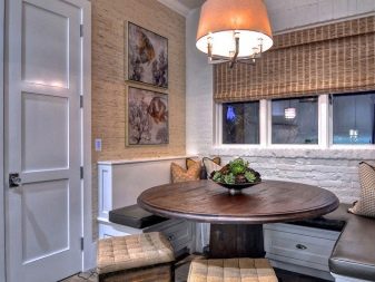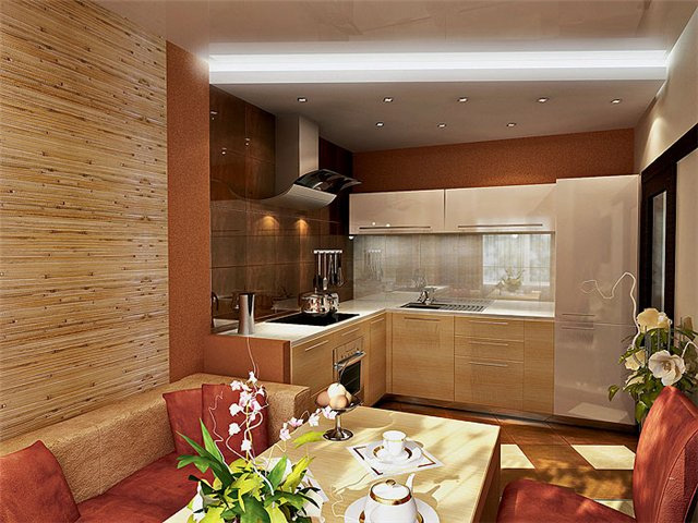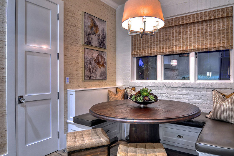 Um die Küche so gemütlich wie möglich zu gestalten, werden die Leinwände in Verbindung mit den Möbeln ausgewählt. Zusätzlich ist das Zimmer mit bemalten Gerichten dekoriert. Die Wände sind mit schokoladenfarbenen Tapeten dekoriert und die Möbel sind mit einer glänzenden Oberfläche gewählt. So entsteht ein ungewöhnlicher Kontrast und der Raum ist mit Wärme und Komfort erfüllt.