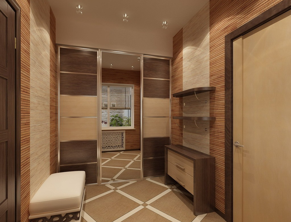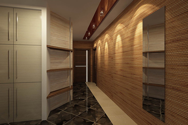 Die Dekoration der Eingangshalle, die mit dieser Art von Tapete dekoriert ist, sollte nicht auf nur einen traditionellen Schrank beschränkt sein, um die dumpfe Atmosphäre im Raum zu verdünnen, Korbmöbel empfohlen. Wenn die Größe des Raumes groß ist, dann ist es gut, es mit hellen Osmanen zu füllen, die vor dem Hintergrund von Wandpaneelen gut aussehen, die afrikanischem Stil ähneln. Es ist gut, den Innenraum mit Zeichnungen mit Hieroglyphen, Zimmerpflanzen mit großen Blättern zu ergänzen. Es ist möglich, die Wände der Kommode zu kleben und den darüber angebrachten Spiegel mit Muscheln zu schmücken.