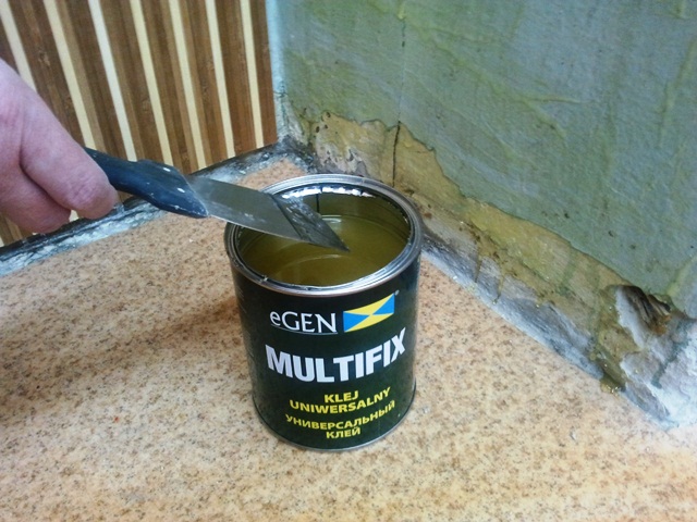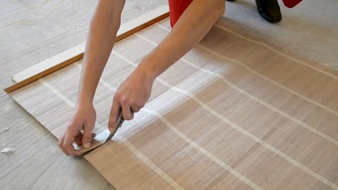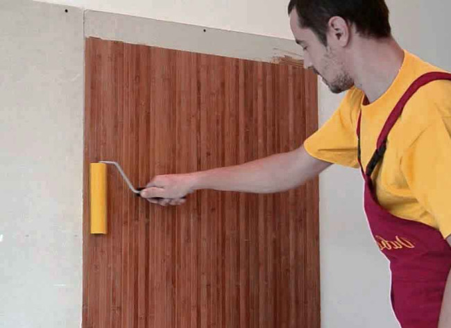 Es ist schwierig, die Tapete auszuführen und zu schneiden. Dies geschieht normalerweise mit einem Konstruktionsmesser, aber der resultierende Querschnitt sieht ungleichmäßig aus. Daher ist es in diesem Fall am besten, eine Metallsäge für Metallarbeiten zu verwenden. Außerdem wird Bambus mit einem speziellen Kleber befestigt, der nicht giftig ist, aber unangenehm riecht. Tragen Sie zur sicheren Installation Gummihandschuhe und ein Atemschutzgerät.