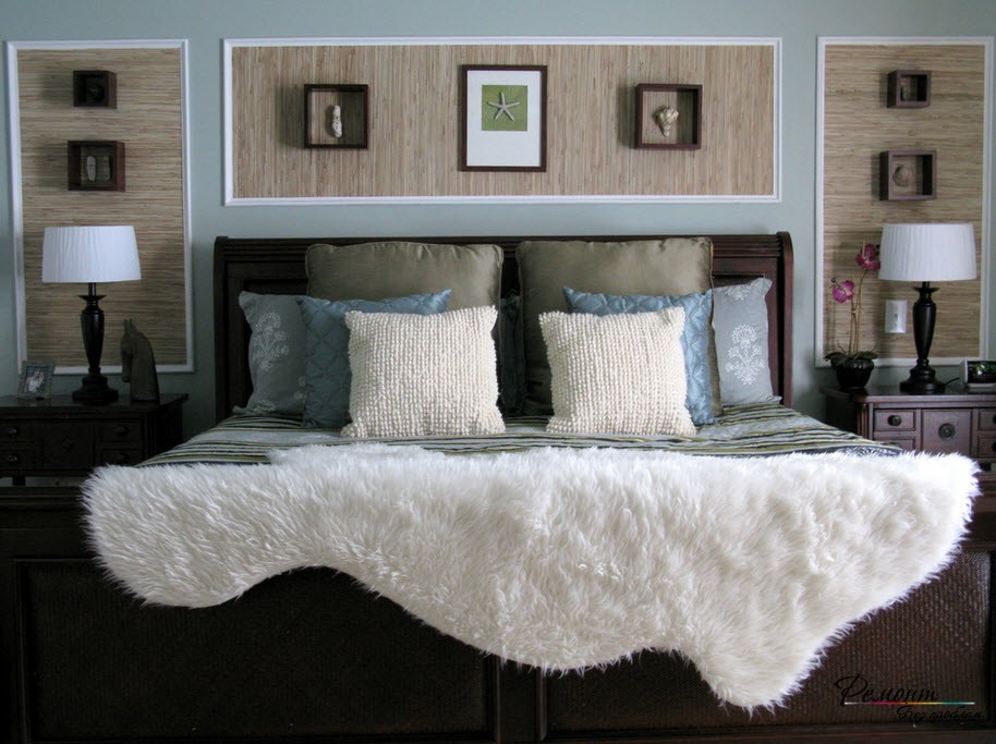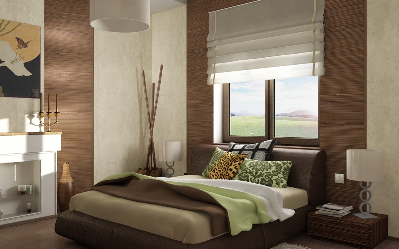 Dies ist ein besonderer Raum im Haus, so dass sein Inneres hauptsächlich auf die Farbe und Art des Materials ausgerichtet ist. Dieser Raum sollte mit einer gemütlichen und entspannenden Atmosphäre gefüllt sein. Daher müssen Sie für die Gestaltung der Wände einen grünen, braunen oder gelben Farbton wählen.Wunderschöner Blick in die Schlafzimmer-Weidetapete, sowie Kork-Leinwände mit ungewöhnlichen Mustern.