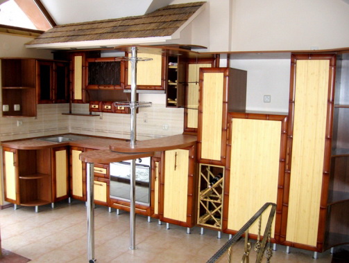 Bambusprodukte werden in eleganten Farben präsentiert, die von weißem Kaffee bis zu einem grünen Pistazien-Farbton reichen. Mit dem "Spiel" mit Beleuchtung können solche Farben im Raum eine ungewöhnliche Palette erhalten, die den Raum interessant und stilvoll macht.