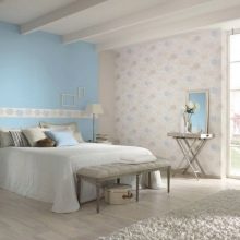 Helle Tapete im Schlafzimmer mit einem zarten Druck in Form von Sakura-Ästen wird jedem jungen Paar gefallen. Romantisches gedämpftes Licht erhellt leicht die Wände darunter und füllt sich mit Gefühlen vondass du auf der abendlichen Sommerveranda bist. Ein grauer Bodenbelag wird den Effekt der Reflexion auf der Oberfläche des Mondscheins erzeugen.