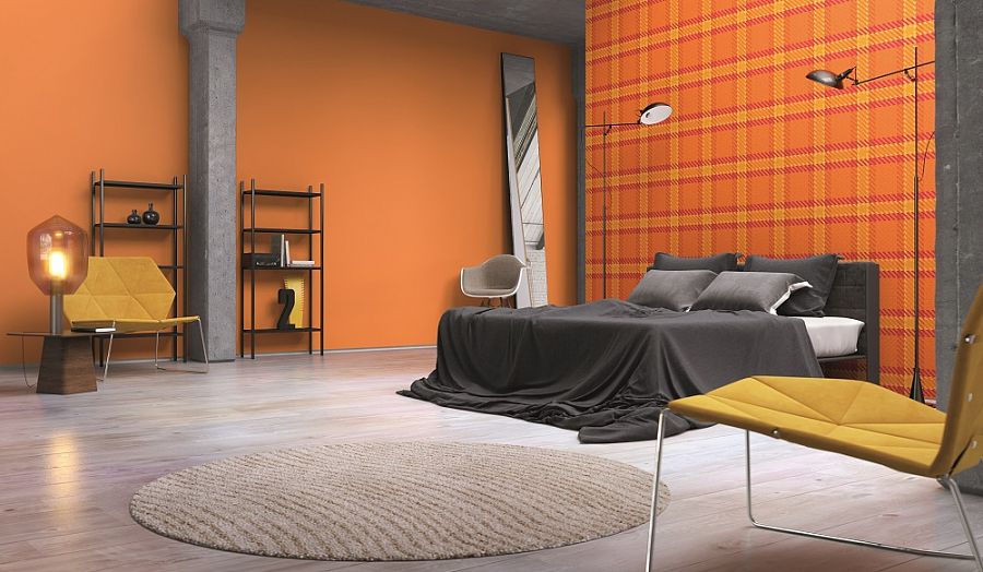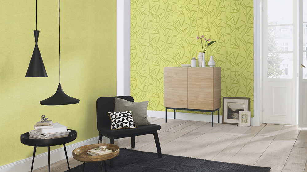 Die ursprüngliche Kombination von Uni-Tapete und Leinwand mit einem Muster zeigt sich am Beispiel der Abgrenzung eines Raumes in eigenständige Zonen.