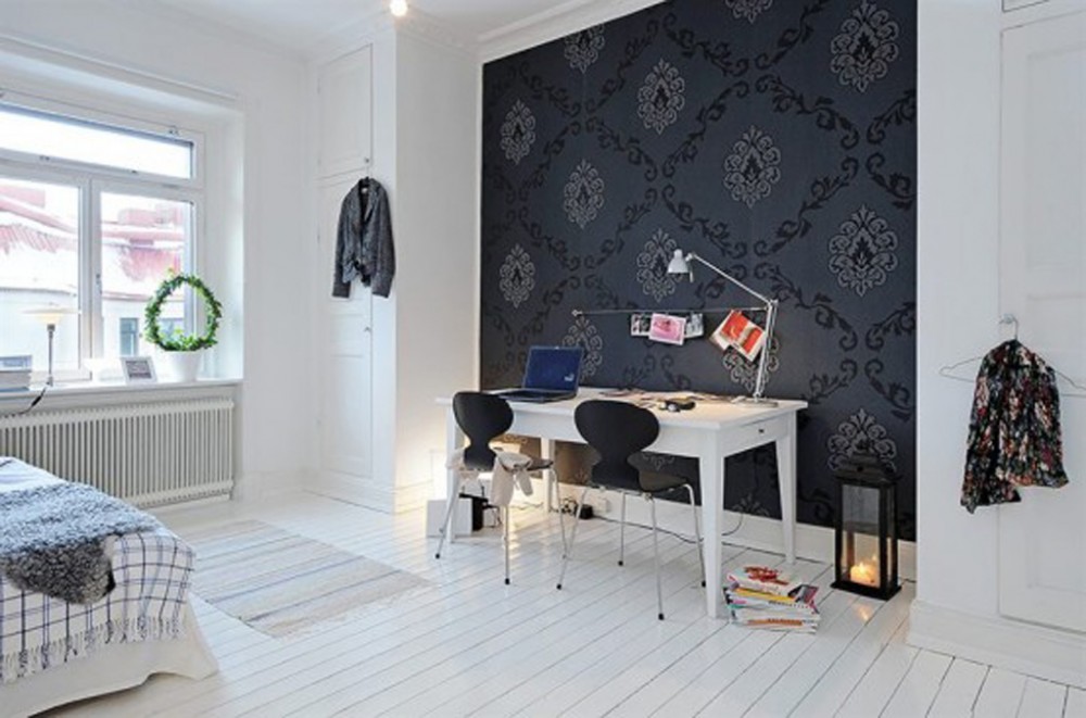 Schwarze Tapeten sehen gut aus mit einer Nische in der Wand. So hebt sich die Lesezone ab.Ein bequemer Stuhl mit einer mobilen Lampe unterstreicht erfolgreich die Funktionalität der Zone.
