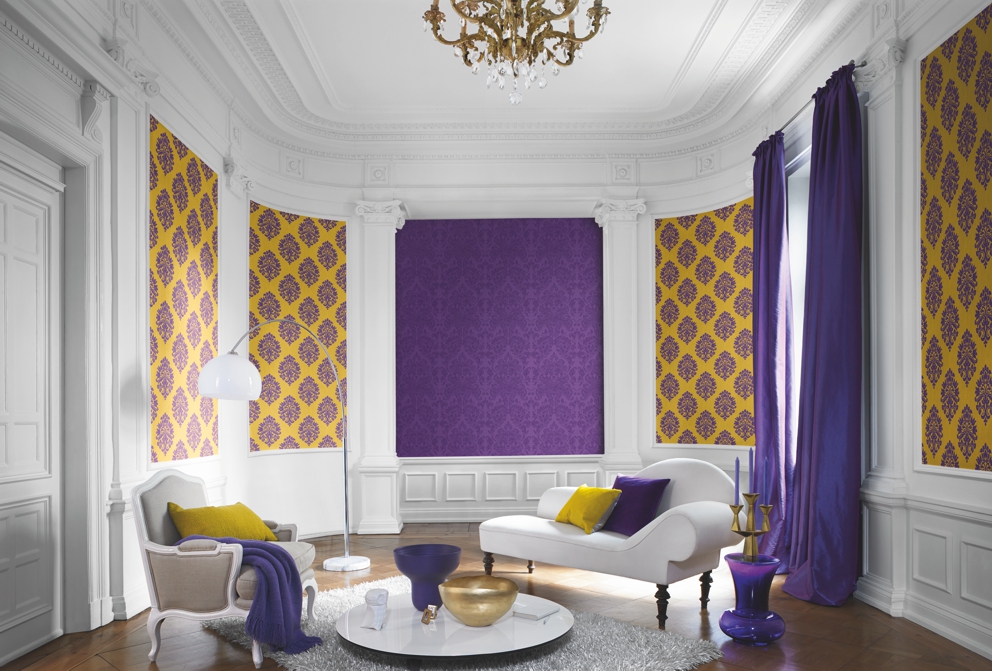 Der Luxus und die Feinheit des Geschmacks des Wohnungseigentümers wird durch Vinyltapeten im Inneren eines kleinen Wohnzimmers im Empire-Stil betont. Weiße Säulen und Stuckdecken heben farbige und einfarbige Tapeten aus einer En Suite Kollektion hervor. Senfblatt mit einem lila Ornament aus einem einzigen Farbton mit Prägetapeten ergänzt die Vasen und Kissen der jeweiligen Farben. Glänzendes Laminat verleiht dem Raum Wärme. Ein massiver Kronleuchter in der Mitte der Decke, als wiederhole er die Konturen des Aufdrucks auf der Tapete.