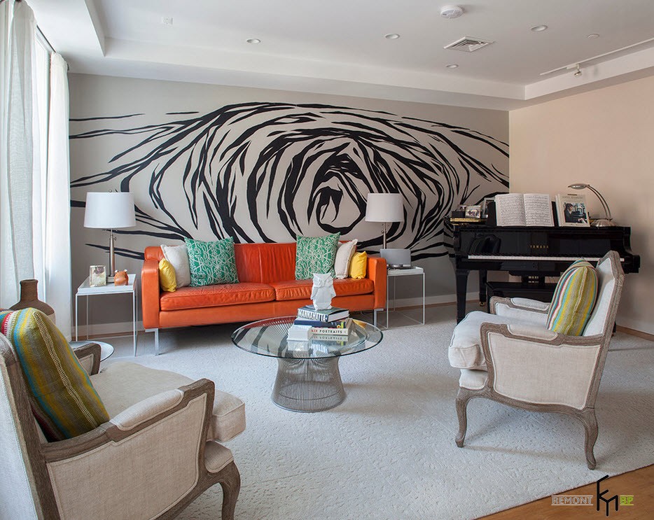Dieser Raum ist zur Entspannung gedacht, aber trotzdem bevorzugen sie normalerweise Feierlichkeit und Helligkeit, die das Leben genießen. Daher sind interessante und schöne abstrakte Zeichnungen genau das Richtige.