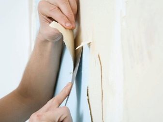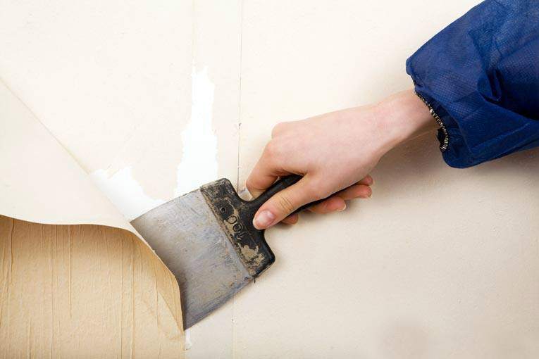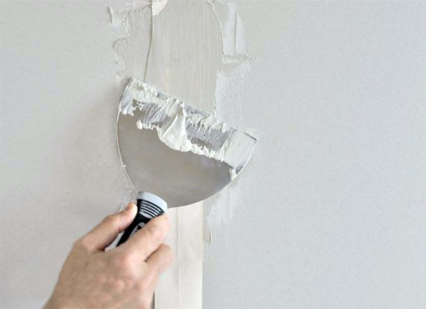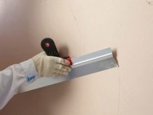 Nachdem die Baumaterialien vorbereitet sind, muss die Oberfläche vor dem Auftragen des Putzes ausgeglichen werden. Wenn alte Tapeten an den Wänden hängen bleiben, wird ein Spatel verwendet.Mit seinem spitzen Winkel wird die Kante der Tapetenstreifen gegriffen und die gesamte Leinwand entfernt.