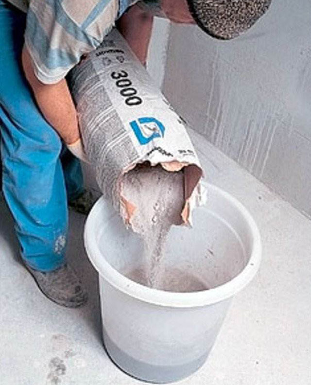 Aber lass uns von der Theorie zur Praxis übergehen. Wasser wird in einen Plastikeimer gegossen, gewöhnlich werden 10 kg Trockenmischung zu zwei Litern hinzugefügt.