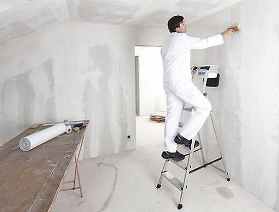 - Schließlich wird eine Grundierungsmischung aufgetragen, aufgrund derer sich ein eigentümlicher Film auf der Oberfläche der Wand bilden sollte.