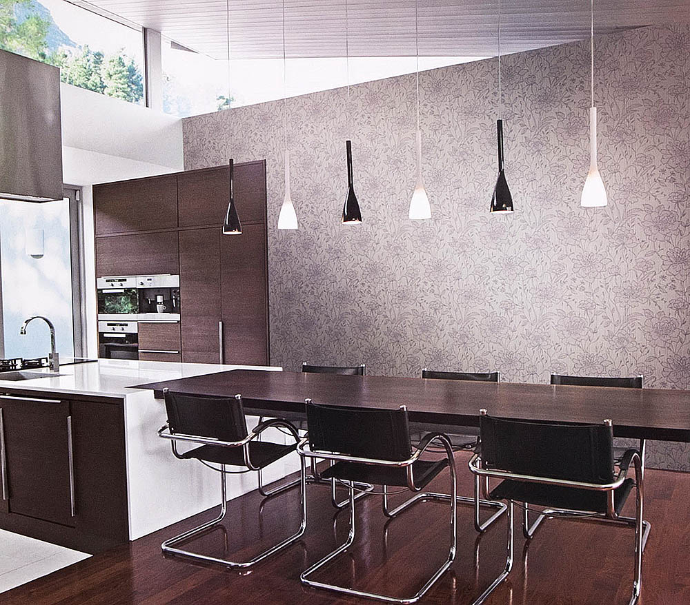 Vinyl (oder wasserdicht) haben eine Reliefschicht, mit der Sie andere natürliche Materialien (Holz, Stein, etc.) nachahmen können. Darunter befindet sich eine Papierschicht, mit der Sie eine gute Haftung an der Wand erzielen können.Der Hauptvorteil dieses Typs ist Feuchtigkeitsbeständigkeit und Beständigkeit gegenüber externen Faktoren. Eine zusätzliche Schutzschicht (auf der die Zeichnung angebracht ist) ermöglicht die Verwendung einer Wandverkleidung in Räumen mit hoher Feuchtigkeit (Küche, Bad) sowie, falls erforderlich, Nassreinigung.