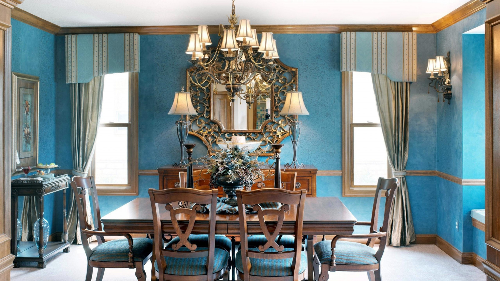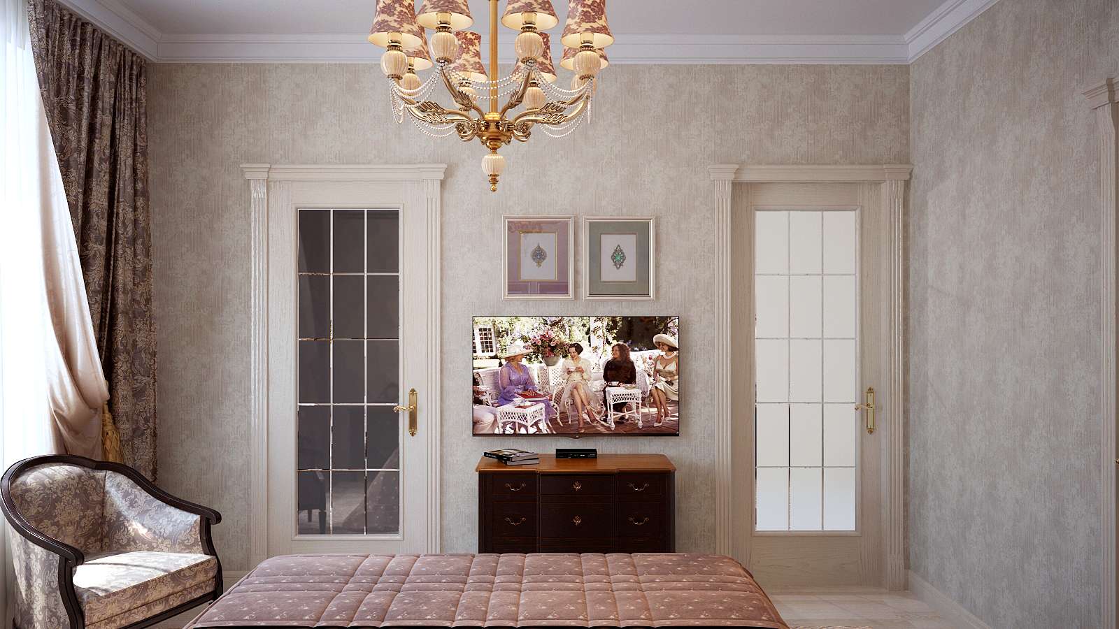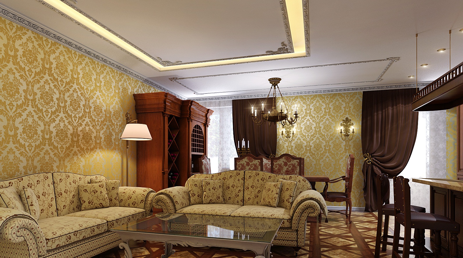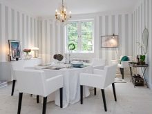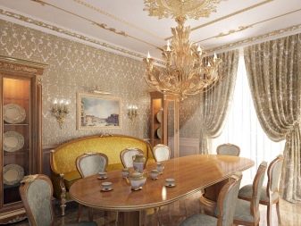 - Klassisch Ähnliche Details finden sich im klassischen Stil. Es zeichnet sich durch symmetrische Muster in verschiedenen Größen, exquisite vergoldete Details und die Verwendung kontrastierender Details aus.Zum Beispiel kann die helle Basis des Raumes mit Streifen, stilisiert als Naturholz oder einfache dunkle Einsätze ergänzt werden. Die Basis der Tapete wird zum Beispiel den veredelten Stuck oder das Formteil ergänzen. Solche exquisiten Akzente sind jedoch eher in großen Räumen angebracht, in denen Platz für zusätzliche Dekoration ist.