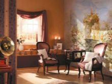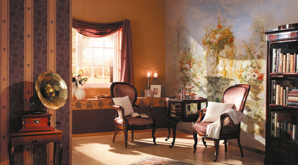 - Luxus alt. Das Zimmer im alten Stil verwandelt sich, wenn Sie schöne Vintage-Tapeten in Kombination mit Zierleisten, stilvollen Holzrahmen und anderen dekorativen Elementen verwenden. Sie werden dazu beitragen, die Atmosphäre der Vergangenheit so greifbar und real wie möglich zu machen. Von der Fototapete sind die luxuriösen architektonischen Strukturen, antike Fresken oder schöne Paneele bemerkenswert.