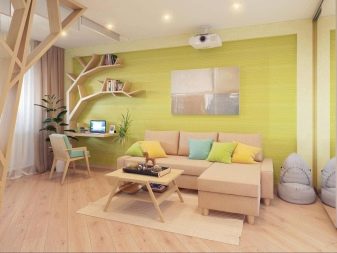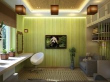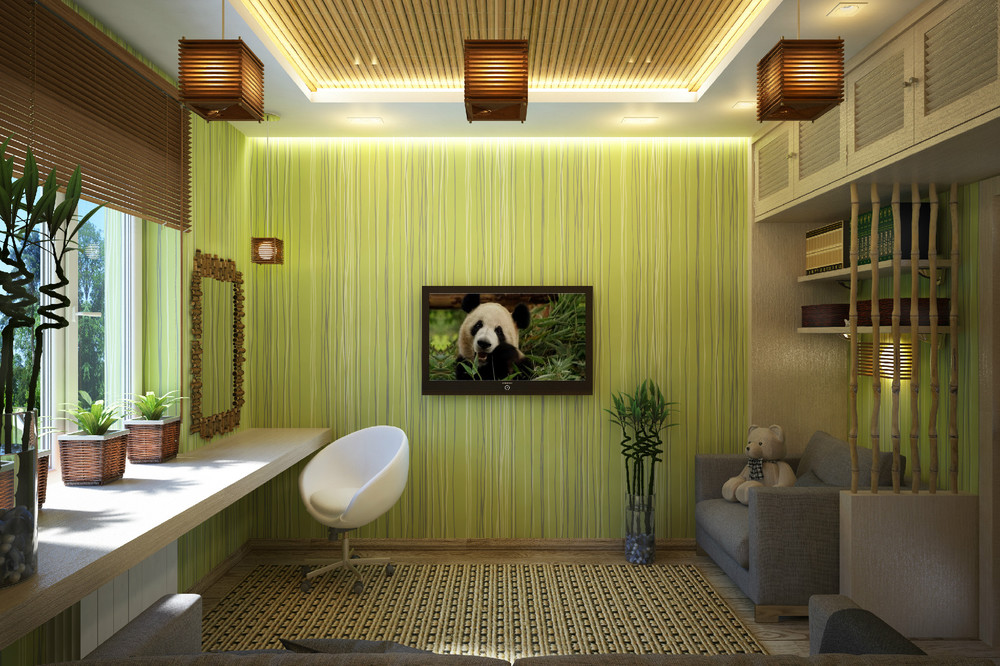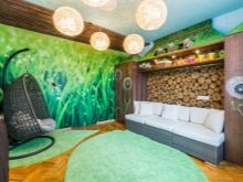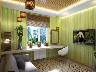 - Eco. Die Räume, die in Ecostyle dekoriert sind, sind jetzt auch populär. Sie zeichnen sich durch den Einsatz natürlicher Materialien aus. Hier können Sie beispielsweise dünne Bambus-Tapeten wählen. Oder, wenn diese Option nicht geeignet ist, beschränken Sie sich auf eine leichte Wandverkleidung, die mit exquisiten Gemälden im Gemüsestil dekoriert ist. Der Druck kann dunkel und in verschiedenen Grüntönen ausgeführt sein.