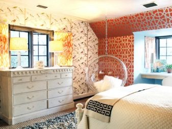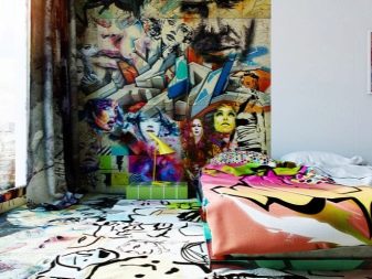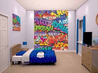 - Eine Explosion von Farben. Vermeiden Sie störende helle Akzente im Raum. Bunte Tapeten in Form von Graffiti passen perfekt in den Raum in einem modernen Stil. Solch helle Akzente werden sowohl Jugendliche als auch Erwachsene mit einem modernen Lebensgefühl begeistern. Es empfiehlt sich, die Muster so zu wählen, dass sie mit dem allgemeinen Stil des Raumes kombiniert werden.