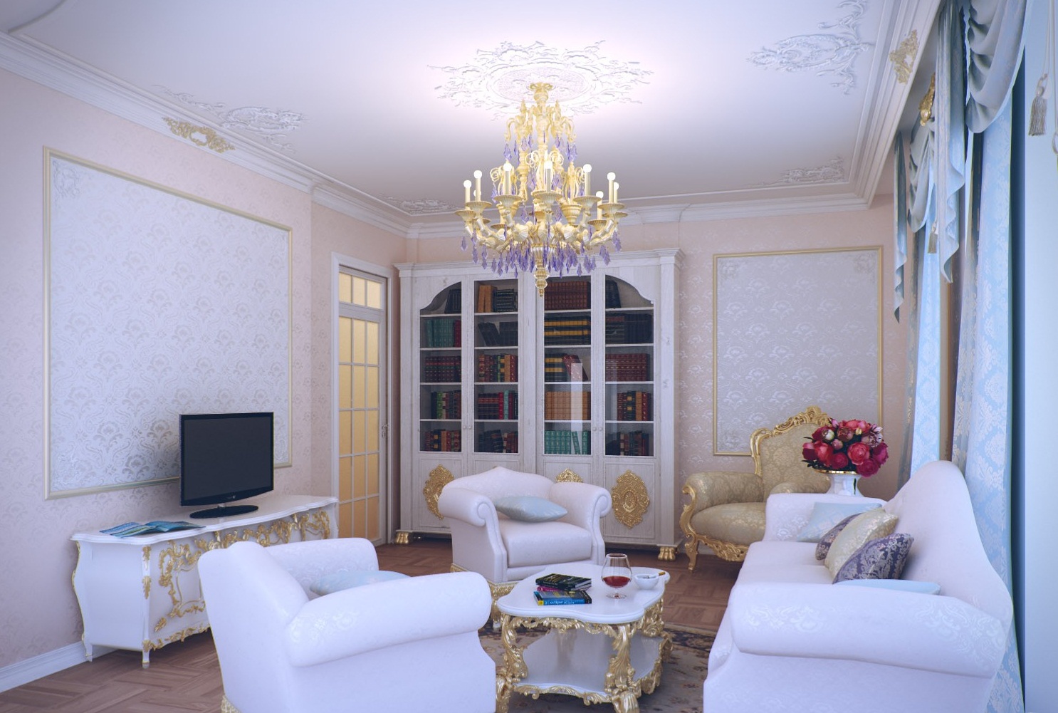 Die Regeln für die Auswahl sind ziemlich einfach.Wenn Sie eine Design-Option für einen kleinen Raum suchen, ist es besser, auf die hellen Innenräume zu achten. Es kann ein High-Tech-Raum, Rokoko oder ein Klassiker mit leichten Details sein. Dadurch wird der Raum optisch geräumiger. Helle Innenräume eignen sich gut für das Design moderner Apartments oder Studios.