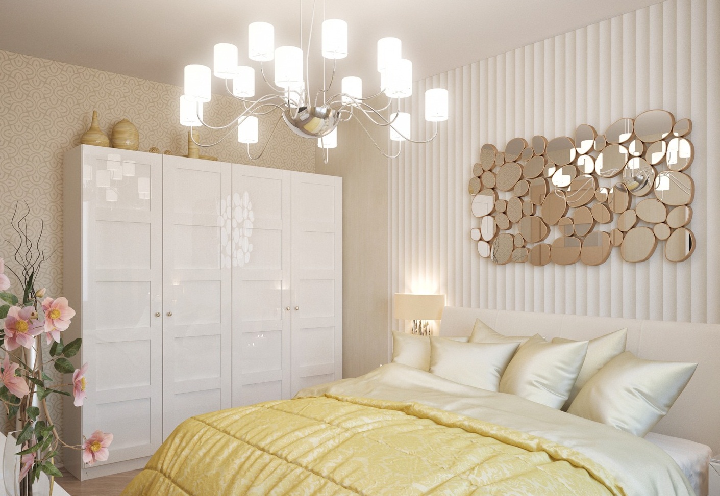 - Helles und geräumiges Zimmer. Wie bereits erwähnt, sind es Lichtfarben, die am besten geeignet sind, den Raum optisch zu erweitern. Spiegeltapete hilft, diesen Effekt hinzuzufügen. Diese Wandverkleidung ist relativ kürzlich erschienen.Seine Oberfläche ähnelt einem realen Spiegel - sie reflektiert auch alle Objekte und wird gleichzeitig auch schnell schmutzig. Spiegeltapete kann nicht nur im Schatten des Metalls sein. Es gibt schöne goldene, bronzene oder silberne Spiegeltapete. Sie können sie beide für die Platzierung von Akzenten in einer sehr kleinen Menge und für einen Teil des Raumes, der darin reflektiert wird, verwenden. Um diesen Effekt zu erzielen, müssen Sie die gesamte Wand mit Spiegeltapete versehen.