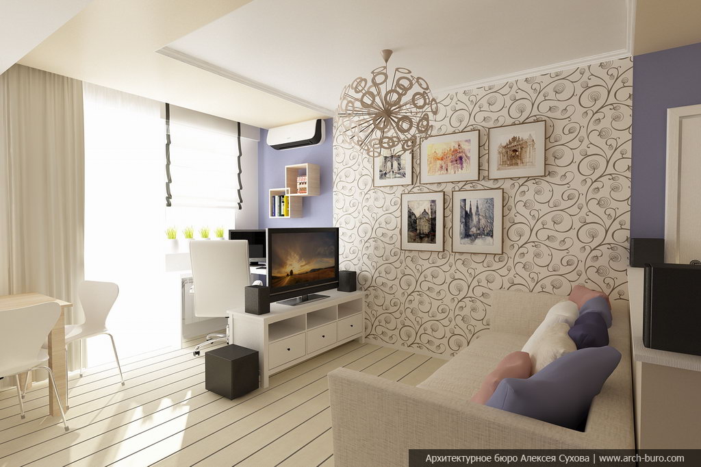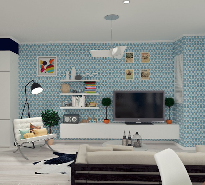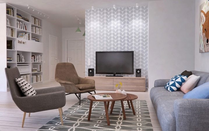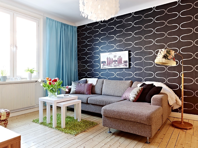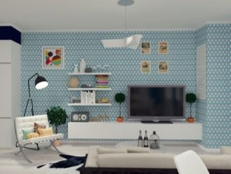 - Für kleine Räume ist die beste Lösung, die Wand zu tapezieren, die als Hintergrund für ein Sofa, Regale oder einen Fernseher dient.