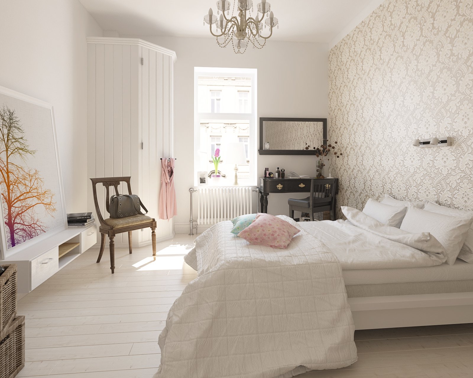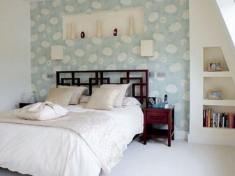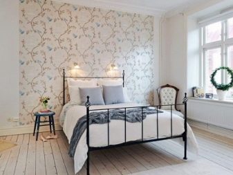 Dieses Zimmer, wie oben beschrieben, ist auch berechtigt, mit Tapeten aus hellen und pastelligen Tönen zu dekorieren. Die beste Lösung in dieser Situation ist die Verwendung von Wandbedeckungen, die mit floralen Mustern, Linien ohne Biegungen oder Wellen verziert sind - Ornamente, die den Innenraum interessanter machen. Zusätzlich können die folgenden einfachen Regeln für einen Schlafzimmerbesitzer nützlich sein: