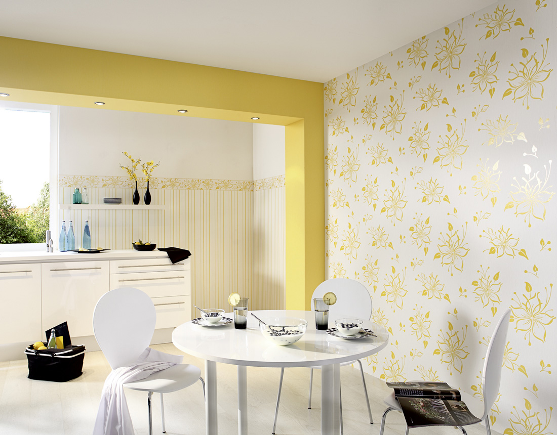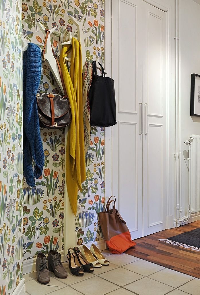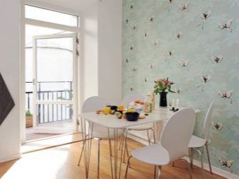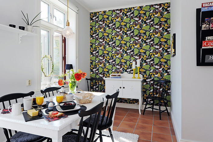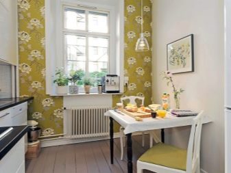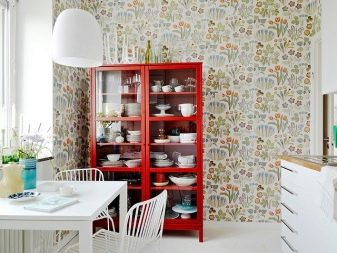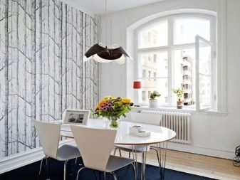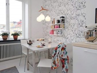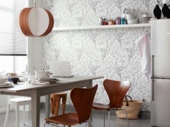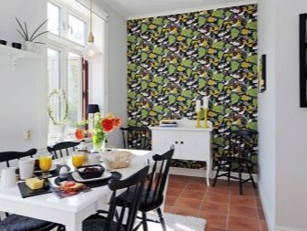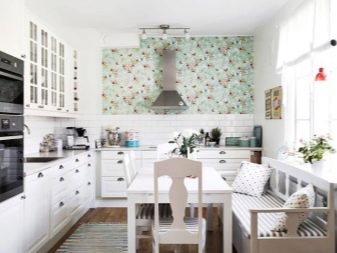 - Für die Gestaltung der Küche ist es sinnvoll, die Tapete zu verwenden, die die Flora und Fauna Skandinaviens abbildet. Eine Alternative sind Materialien mit floralen oder geometrischen Mustern.