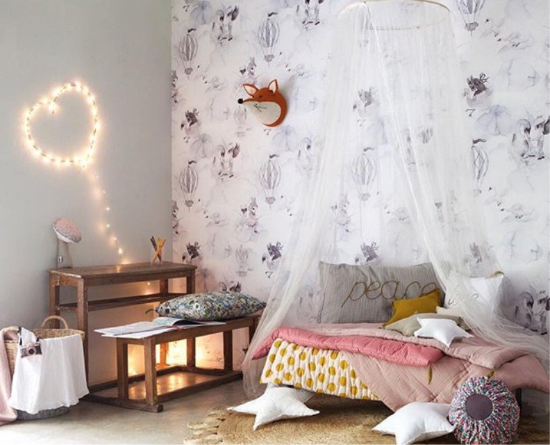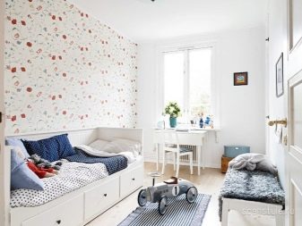 Dekorieren von Tapeten im skandinavischen Stil ist auch für andere Räume relevant. Da sie leicht sind, werden solche Materialien eine ausgezeichnete Ergänzung zum Inneren des Studiums sein, ohne die Aufmerksamkeit abzulenken und gleichzeitig eine fruchtbare Aktivität aufzubauen. Wandbeläge in Pastellfarben und ergänzt durch märchenhafte Illustrationen eignen sich ideal als Kinderzimmer für eine Spiel- und Schlafzone. Störe nicht mit fröhlichen Leinwänden und im Flurvor allem der, dem es an natürlichem Licht mangelt.