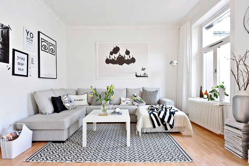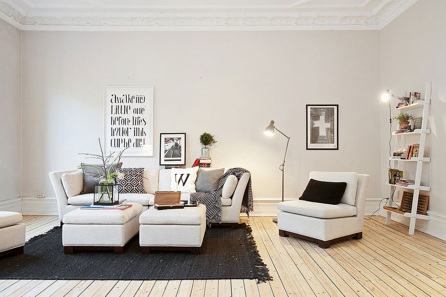 Unter allen Lösungen, mit denen Sie ein wirklich skandinavisches Interieur schaffen können, ist das Design des gesamten Wohnzimmers in hellen Farben am wenigsten anspruchsvoll. Viele Experten empfehlen jedoch, sich auf die Verwendung von Kontrasten zu verlassen, besonders wenn es zu viele Weißtöne gibt. Ihre wichtigsten Tipps sind unten aufgeführt: