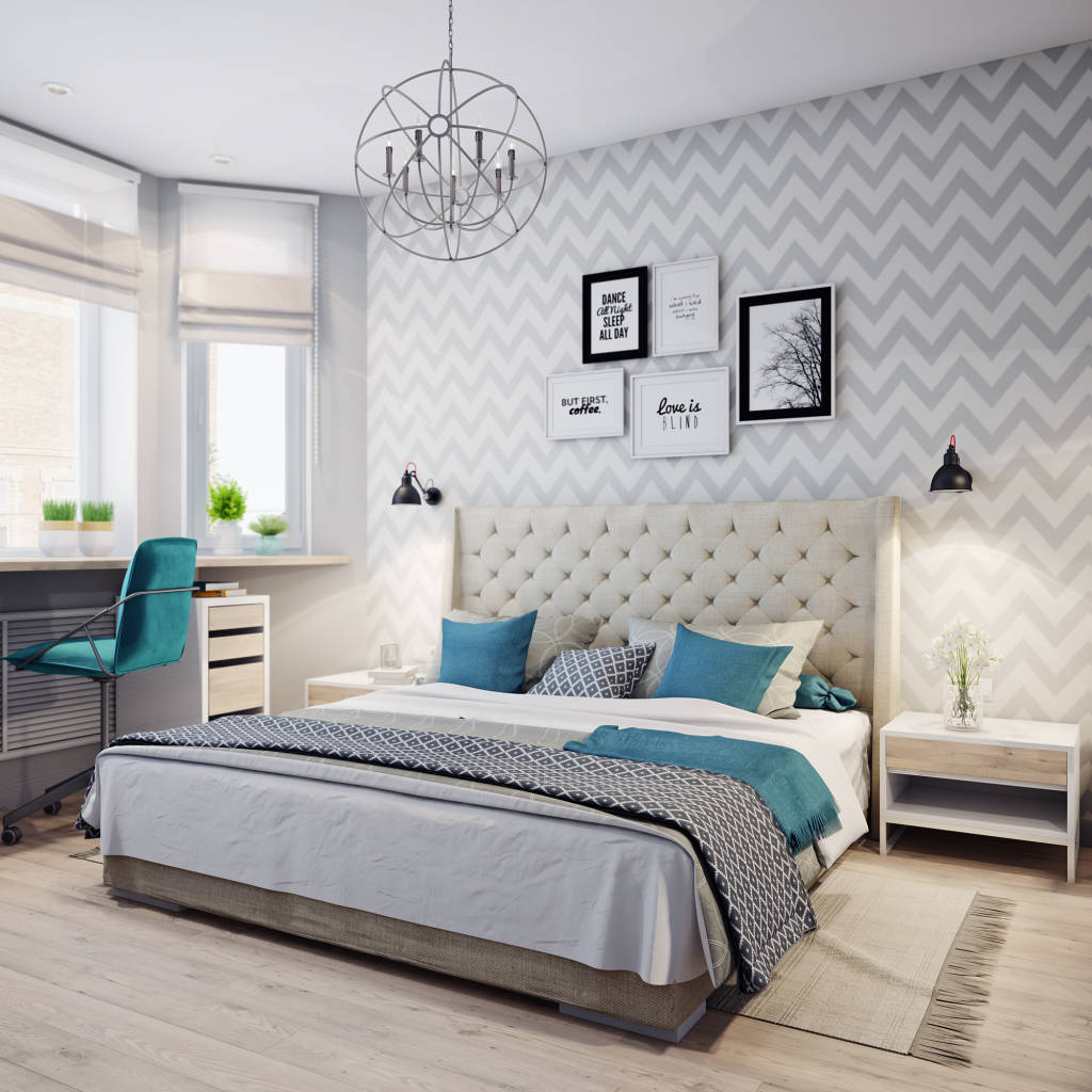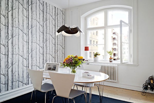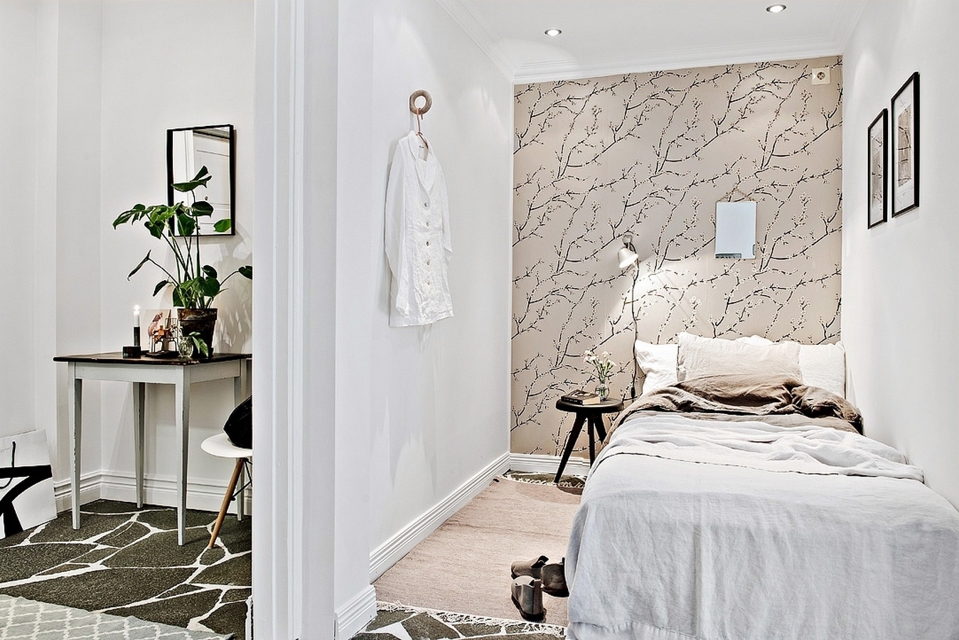 Wenn Sie die wichtigste Regel für die Verwendung von Tapeten im skandinavischen Stil wählen, dann impliziert dies die Weigerung, alle Wände gleichzeitig zugunsten eines einzigen zu kleben. Dieses Prinzip ist für alle farbigen Materialien relevant, unabhängig davon, ob eine Zeichnung darauf angebracht ist oder nicht. Mit dieser Technik können Sie erstellen spektakulärer Kontrast Daher wird dringend empfohlen, es nicht abzulehnen. Die einzigen Ausnahmen sind weiße und hellgraue Tapeten, deren Aussehen nah an bemalten und verputzten Oberflächen ist: solche Beschichtungen können über alle Wände geklebt werden.