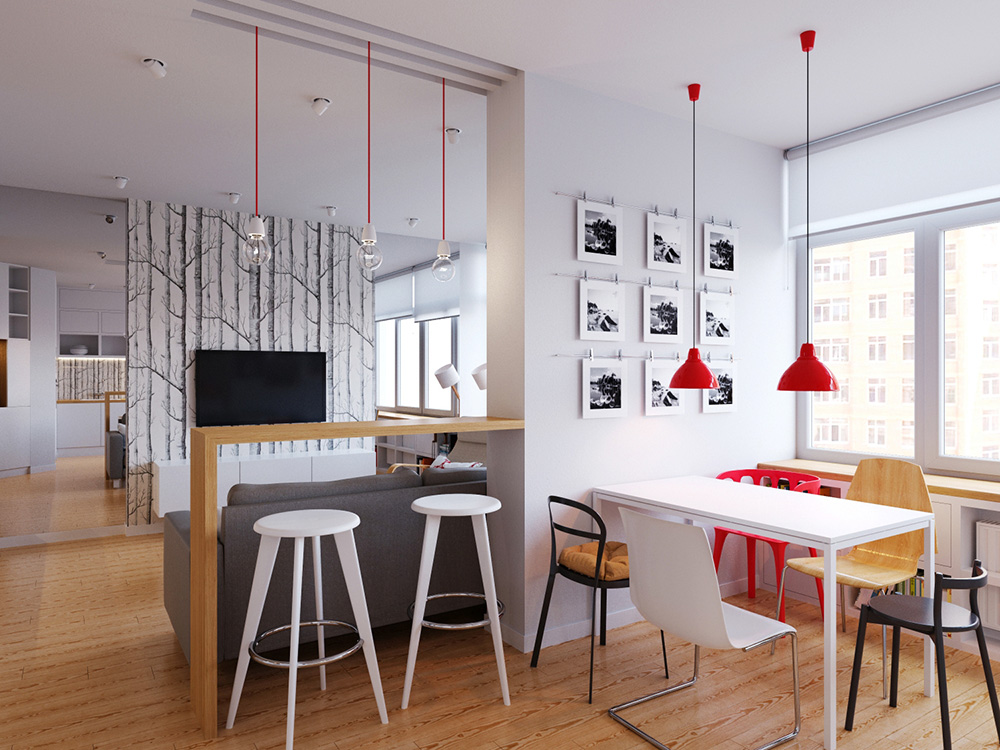 Das Hauptmerkmal des skandinavischen Stils, der viel mit dem Minimalismus zu tun hat, ist die Schlichtheit des Finishs, in dem Weiß oder Hellgrau vorherrschen. Gleichzeitig zeichnet er sich durch helle Akzente aus, die den Räumen einen ausdrucksstarken Charakter verleihen.