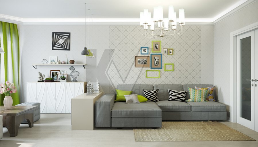 - in dem Fall, wenn der Raum eine rechteckige Form hat, ist es empfehlenswert, Tapeten zu verwenden, um eine kürzere Wand zu schmücken, wodurch der Raum visuell vergrößert wird;
