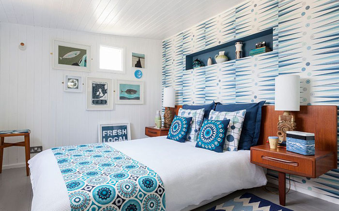 - Für Wände mit monochromen hellen Tapeten müssen Sie eine geeignete Ergänzung wählen.Dies kann ein kleines Bild oder ein Originalzubehör sein.