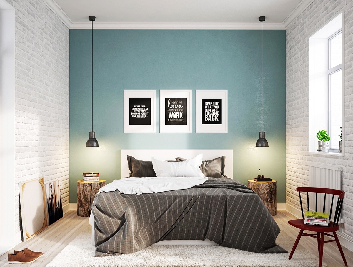 - Um den Bereich in der Nähe des Bettes hervorzuheben, sind dunkle oder warme Farben am besten geeignet, vorausgesetzt, dass die Möbelstücke und die Bettwäsche darin hell sind.