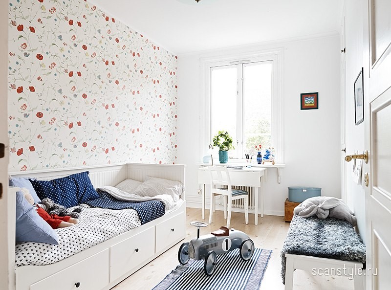 - Da die Dunkelheit des skandinavischen Stils ungewöhnlich ist, sollte der Boden im Raum so hell wie möglich sein.Die Erfüllung dieser Bedingung macht die Verwendung von Tapeten, um die vorteilhafteste zu betonen.