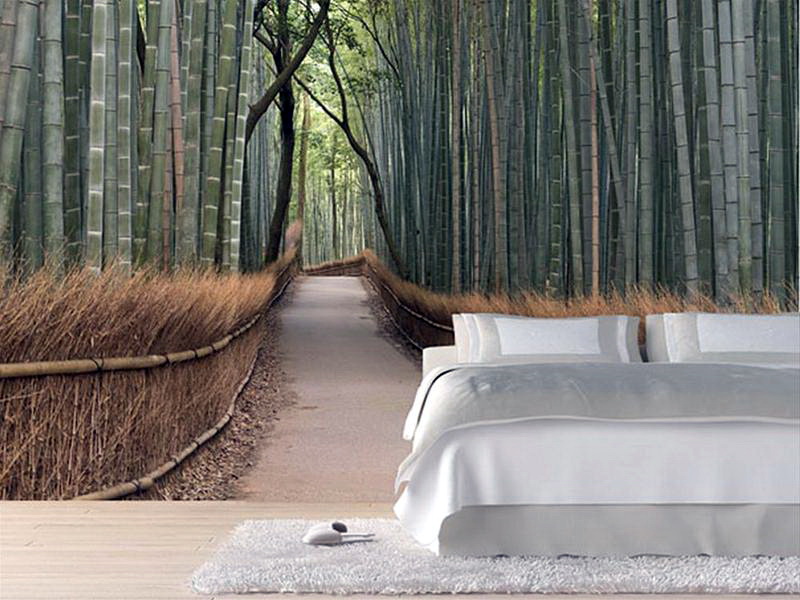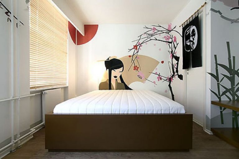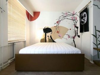 - Abstraktionen, Silhouetten von Menschen und Blumenthemen werden sich für das Schlafzimmer eignen. Am beliebtesten sind heute Tapeten mit japanischen Motiven: Bilder von Kirschblüten, Geisha-Mädchen. Das Boudoir für Jungvermählte kann mit einem persönlichen, in voller Länge stehenden Doppelporträt dekoriert werden, das am oberen Ende des Bettes angebracht ist.