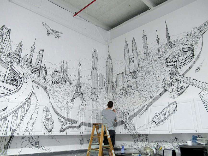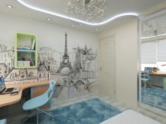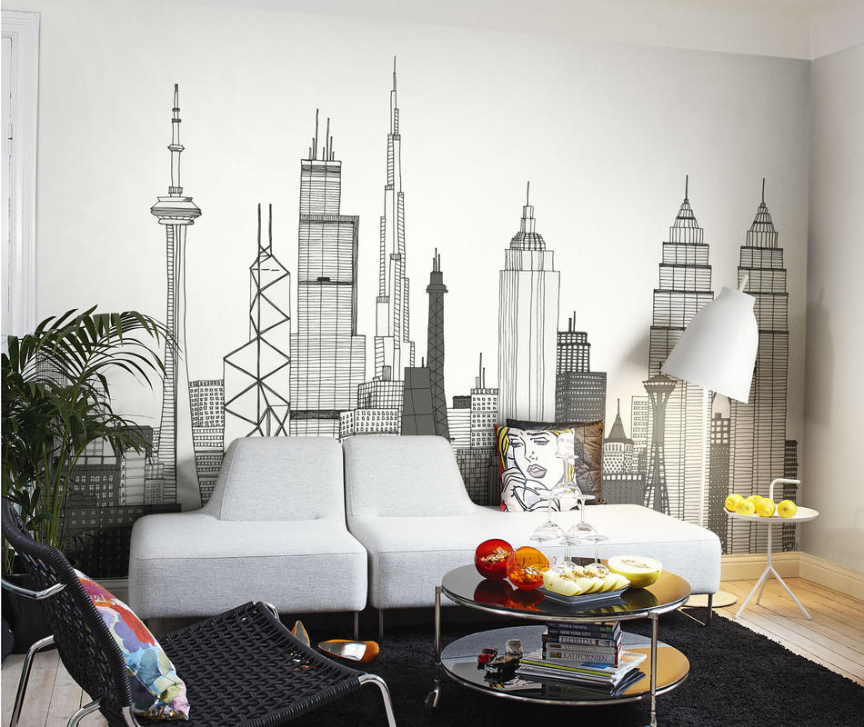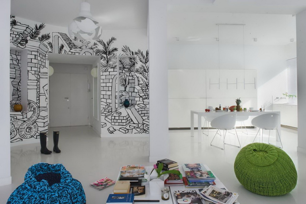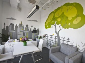 - Wände des Wohnzimmers werden mit Bildern von Megalopolen, architektonischen Strukturen sowie Tier- oder Pflanzenornamenten geschmückt Der beste Ort für Graffiti ist ein Erholungsgebiet;