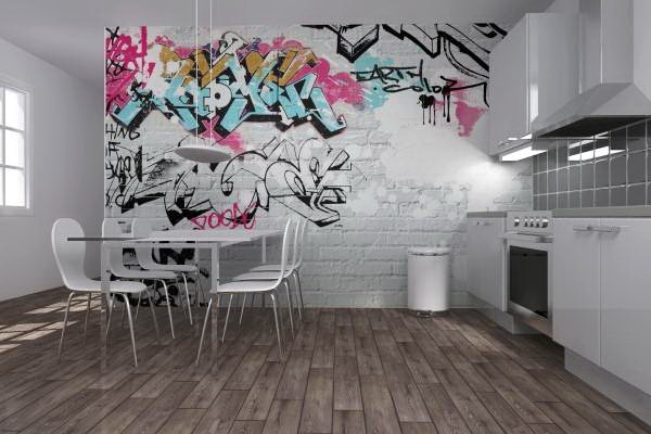 - Straßenkunst-Hintergrundbilder Dies sind Standardtapeten, die in Rollen verkauft werden. Ihre Zeichnung hat keine besonderen Merkmale. Dies können typische Graffiti oder geometrische Formen sein. Solche Fototapeten zeichnen sich durch die Wiederholung des Ornamentmusters aus;