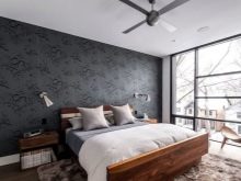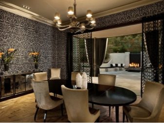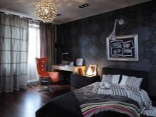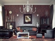 Um das Interieur zu variieren, können Sie nicht auf einfache dunkle Tapete, sondern auf Optionen mit einem Bild wählen. So können beispielsweise als Dekor verschiedene Texturen wirken, die Variante unter der Haut ist heute sehr beliebt. Dunkles Material mit der Textur von Naturleder kann ein wahrhaft einzigartiges Interieur schaffen.