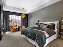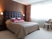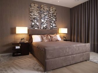 Beim Einkleben des Schlafzimmers ist es besser, zu dunkle Farben in der Dekoration der Wand gegenüber dem Bett zu vermeiden. Diese Option wird auf eine Person "drücken", Schlaf wird unruhig und schwer.Es ist viel besser, die ausgewählte Farbe an der Wand am Kopfende des Bettes zu platzieren, dann wird das Innere harmonisch sein, und der Schlaf wird nicht überschattet.