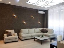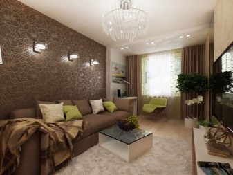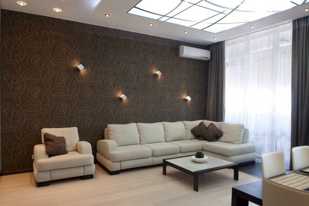 Eine kleine, enge, dunkle Raumfarbe bringt keinen Komfort, sondern nur Dunkelheit,und weiter den Raum eingrenzen, aber der Gesamtraum in diesem Farbschema wird ziemlich harmonisch aussehen. Dunkle Tapetenfarbe ist nur eine Auswahl wert in Räumen mit ausreichender Beleuchtung. Je mehr Licht, desto dunkler können Sie den Farbton der Beschichtung wählen, da sonst die Gefahr besteht, dass Sie einen sehr düsteren und unscheinbaren Innenraum schaffen, in den Sie nicht zurückkehren möchten. Neben der Deckenbeleuchtung sollten Sie Wandleuchten hinzufügen.