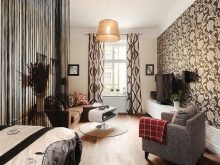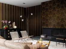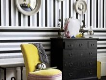 Das Maximum, das Sie wählen können - Dies ist eine helle Tapete mit einem dunklen Muster oder konzentrieren Sie sich zunächst auf die Auswahl leichterer Möbel, die die Farbtiefe der Wände verschatten. Für die optische Ausdehnung des Raumes sollten Sie auf die stilvollen vertikalen Streifen auf der Tapete achten. Diese Option dehnt den Raum aus und gibt ihm mehr Volumen. Um den Platz zu erhöhen, können Sie auch eine glänzende Beschichtung verwenden.